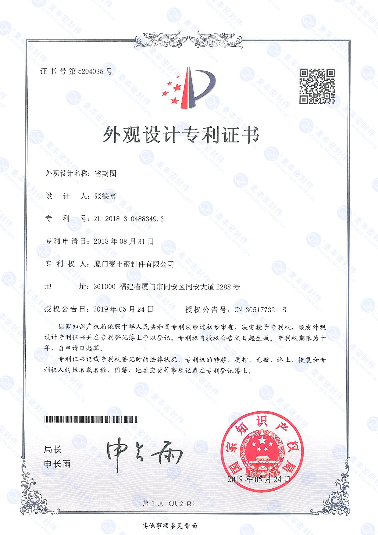 外觀設計專利證書